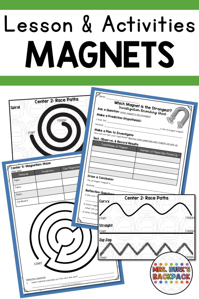 - 5 fun magnet centers including a cut & paste sort, “flying paperclip” investigation, magnet maze, and magnet repel race.